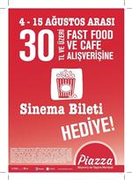 Alışverişe 'Bedava' Sinema KeyfiKahramanmaraş Piazza Alışveriş ve Yaşam Merkezi'nin Fast Food katında 20 TL ve üzeri alışveriş yapanlara bir sinema bileti bedava veriliyor.